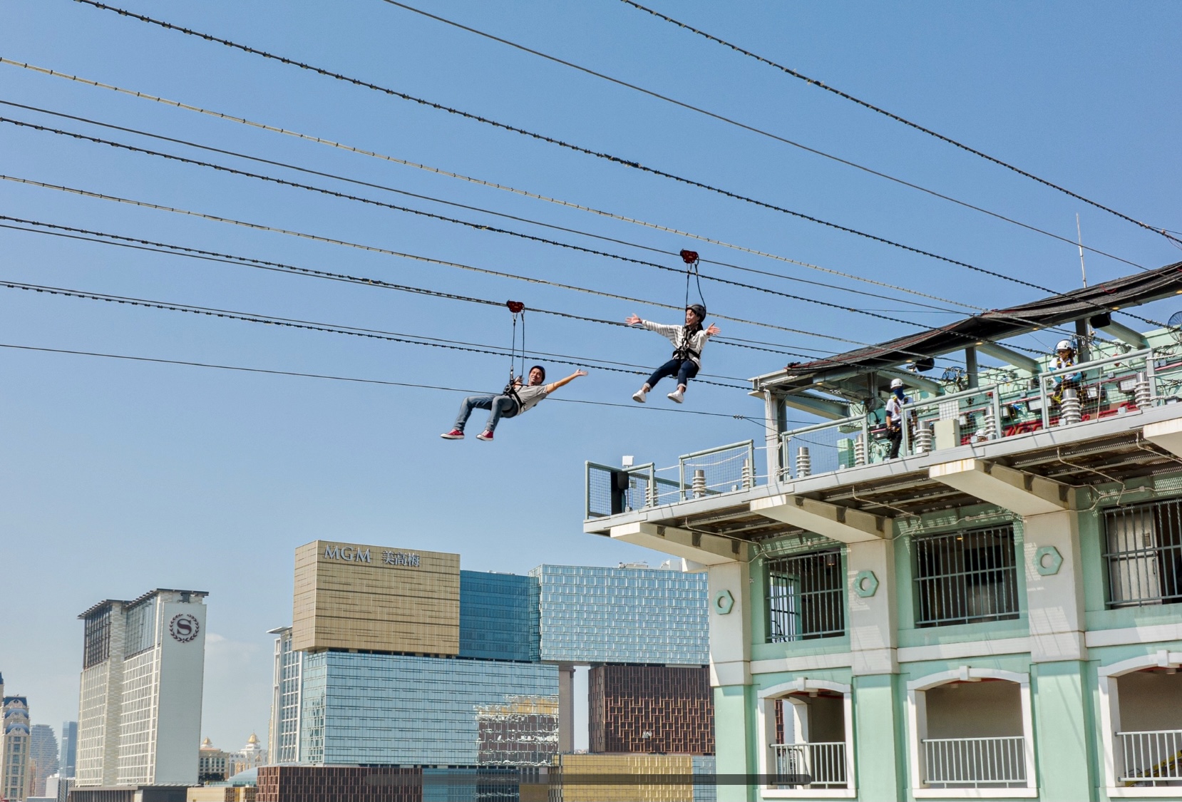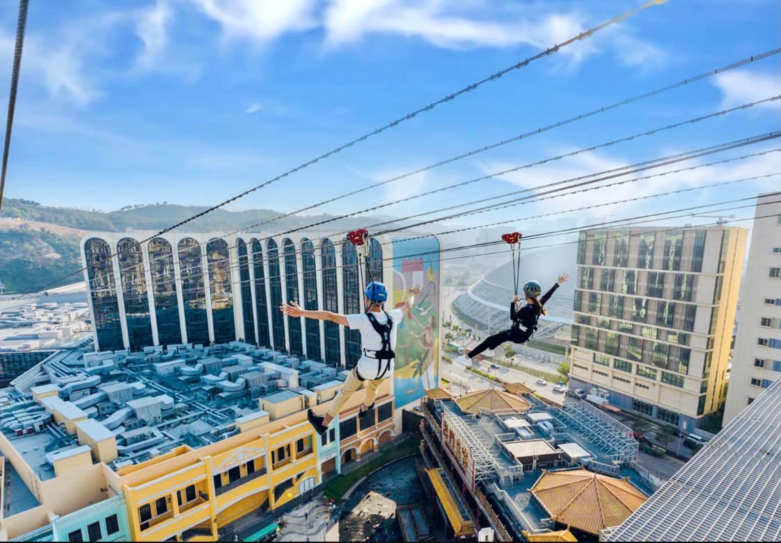澳門飛索設有日間和夜間的飛行體驗: 日間飛行時可以在高空全方位飽覽「澳門葡京人」的壯麗景色 ; 夜間飛行則可享受世界級一流的沉浸式超感官視聽娛樂。兩種飛索旅程體驗都同樣刺激震撼,讓體驗者享受地心吸力帶來的飛一般冒險旅程。