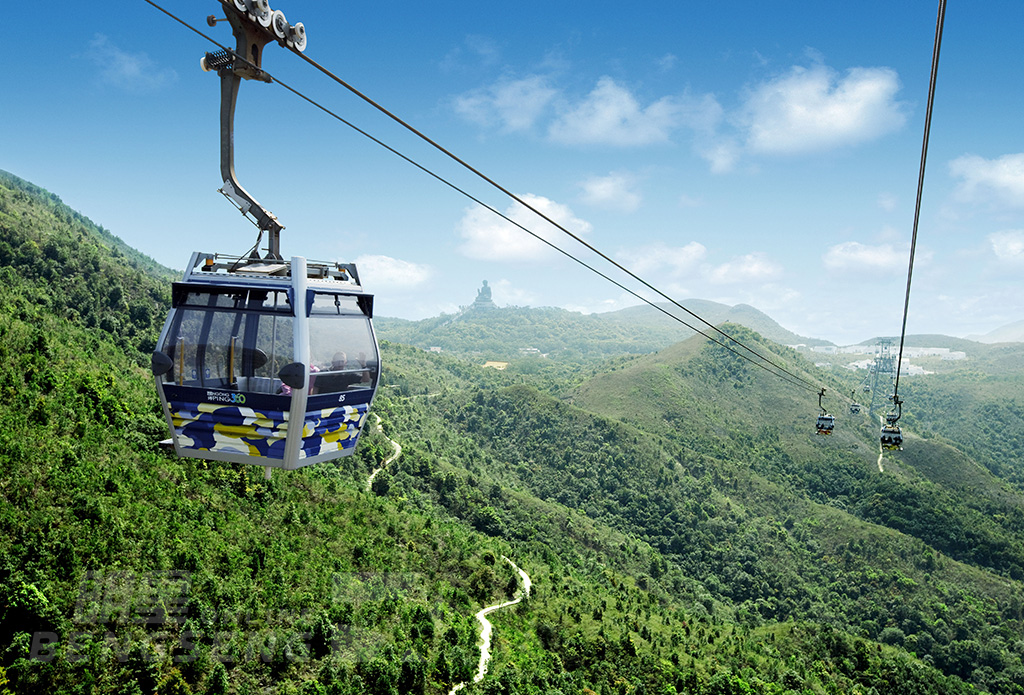 乘搭全長5.7公里的昂坪360纜車登上昂坪高原,單程約25分鐘。纜車沿途可俯瞰翠綠山巒、東涌灣及南中國海景色,天氣良好時更可遠眺港珠澳大橋。